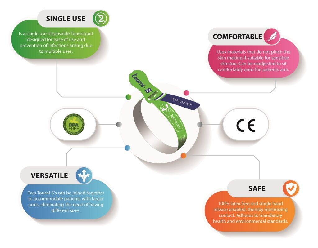 Tourni-S® is a single use disposable Tourniquet designed for optimum comfort. It is safe and easy to use, its simple construction make it lightweight, portable and easy to apply.